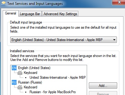 Есть известная проблема в Windows с клавиатурными раскладками на Mac’ах. В стандартной поставке Windows к сожалению нет поддержки раскладки клавиатуры моего MacBookPro. Мне сильно мешало несовпадение того, что нарисовано на клавише и того, что получается на экране. Проблема решилась несложно. И я хочу поделиться этим простым рецептом, к тому же уже не раз описанным в Internet.